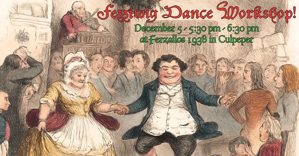 Learn the cheerful party dance that brings the Fezziwig scene to life, taught by expert caller Mr. Steplively and Culpeper’s historic dance community.